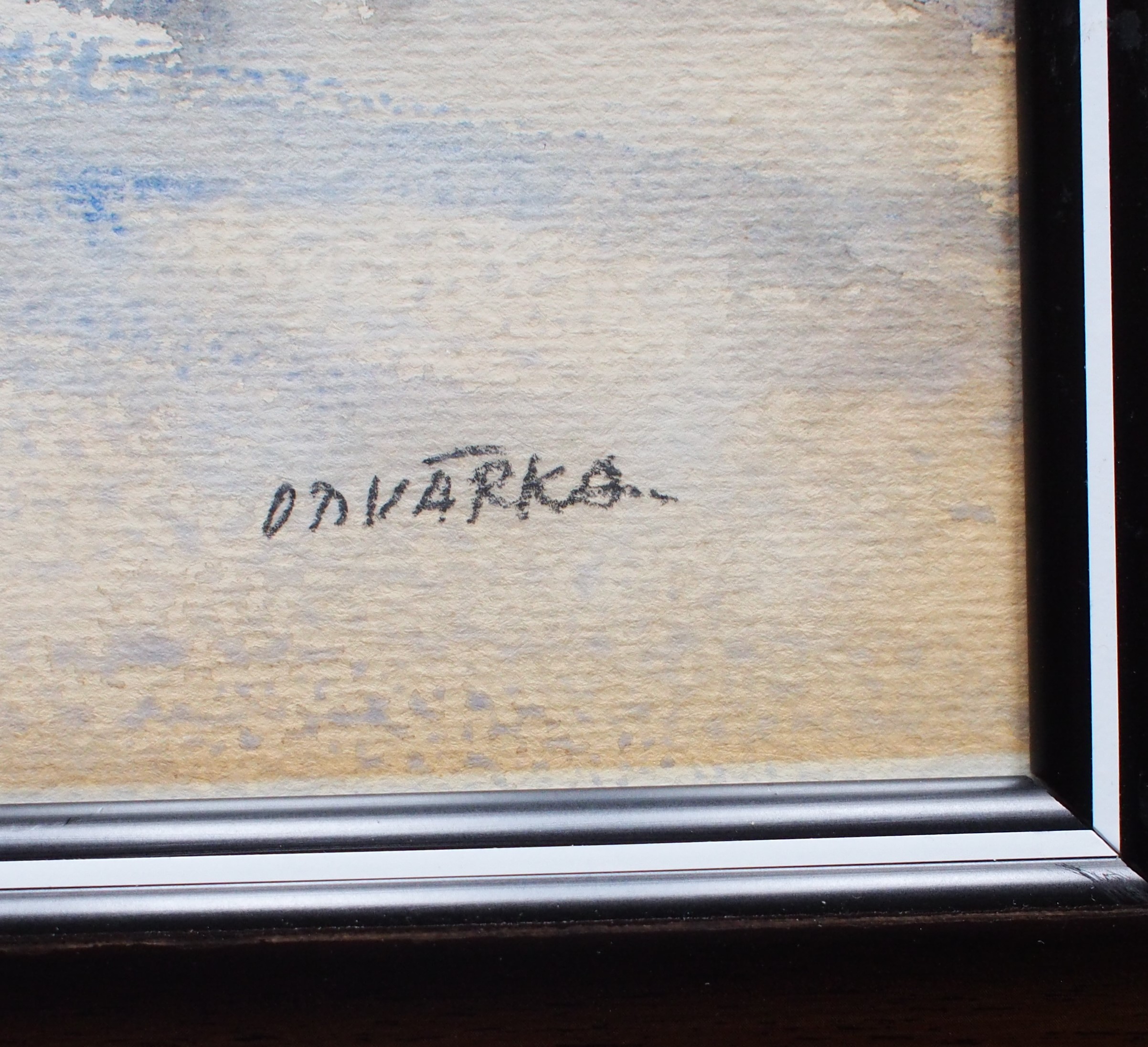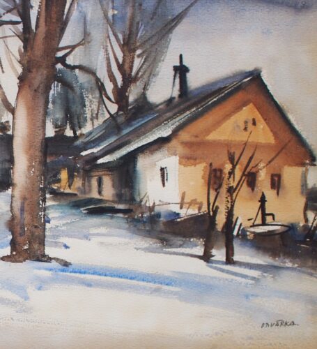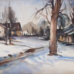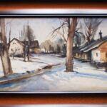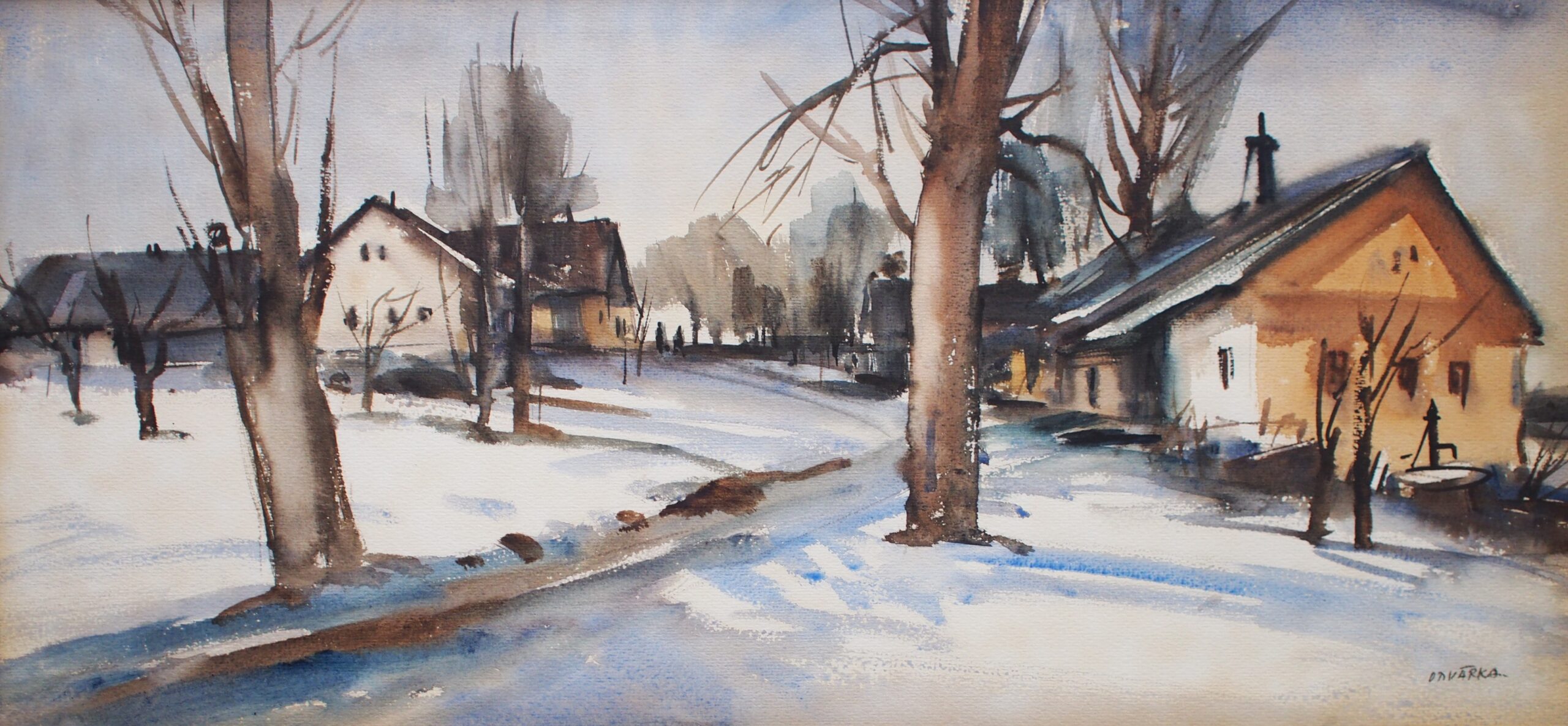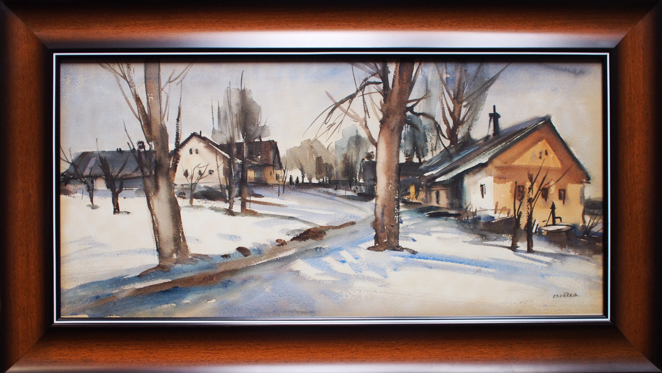 Zima na vsi, akvarel o rozměrech 34×69 cm, s rámem 47×82 cm, signováno.